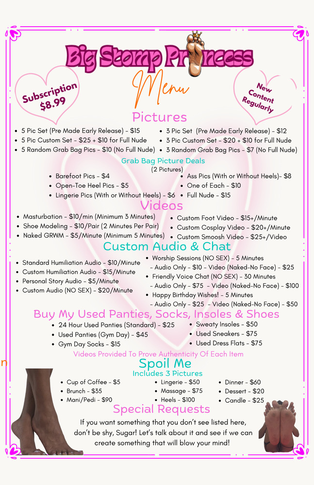 Hey! I'm a sexy Ebony with BIG US 11 sized feet and a gorgeous body that I LOVE to show off! For my feet lovers, please know that I can go weeks to months between pedicures for content purposes unless I'm fulfilling requests, which are ALWAYS WELCOME! So, if you want to see super pretty toes all the time then you may have to be willing to negotiate. All rates and services are included in my Menu so feel free to peruse that to get an idea of what you might like. I do accept custom requests outside of the menu but they are on a case-by-case basis. Don't be shy though, I might be into what you're into!! I'm passionate about fetish modeling, playing dress-up, living authentically, having AMAZING sex, putting little subs and bugs in their place and generally sharing naughty stuff with fellow kinksters! I truly enjoy what I do, so you can expect to be spoiled with new content regularly!! I'll expect you to spoil me in return!! XOXOXOShow more